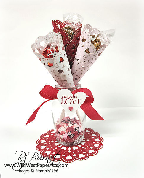 Create a lovely doily bouquet by placing three of them in a little jar along with Loose Valentine pieces. Tie it all up with ribbon and a heart stamped with love.